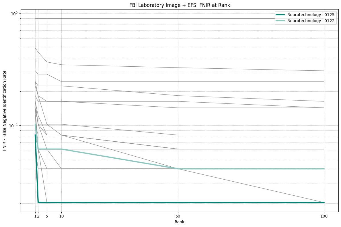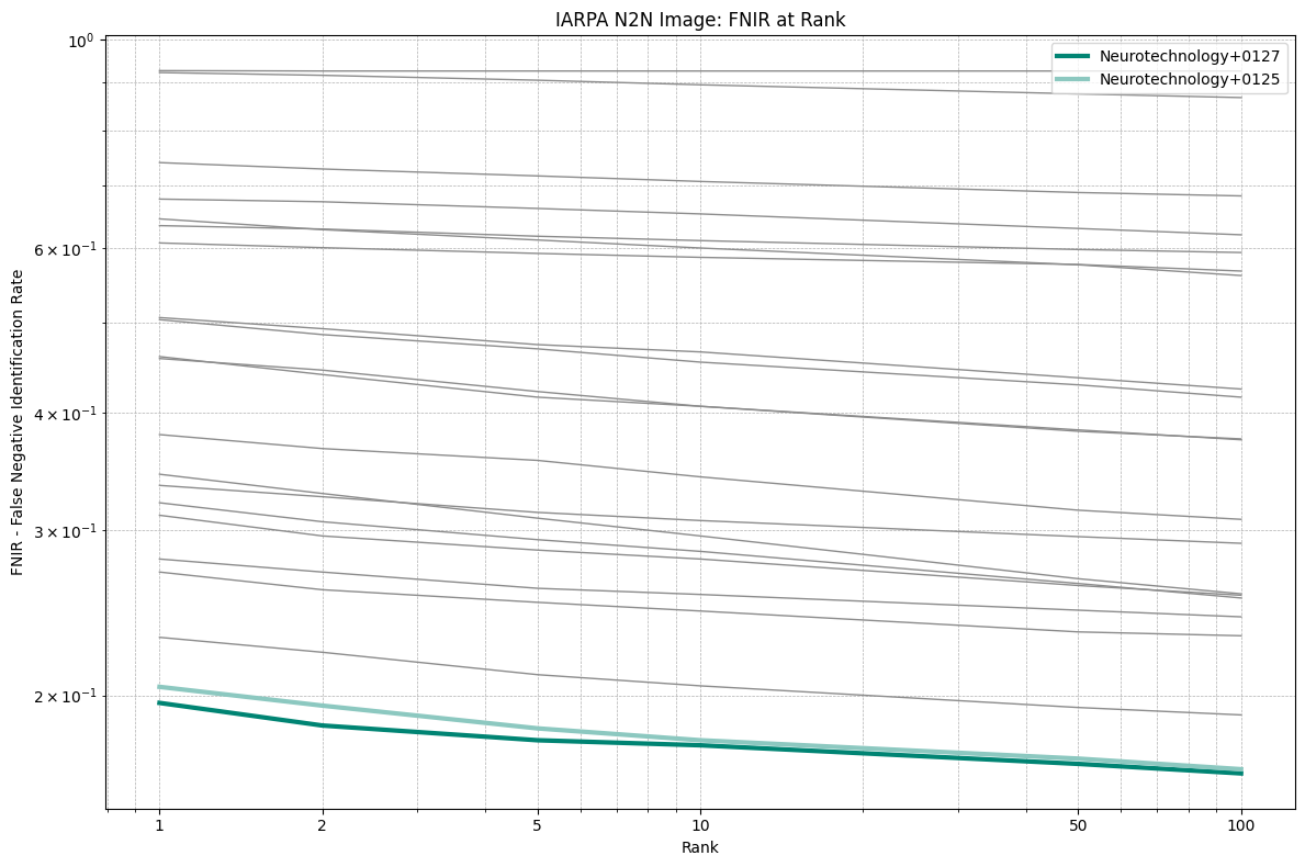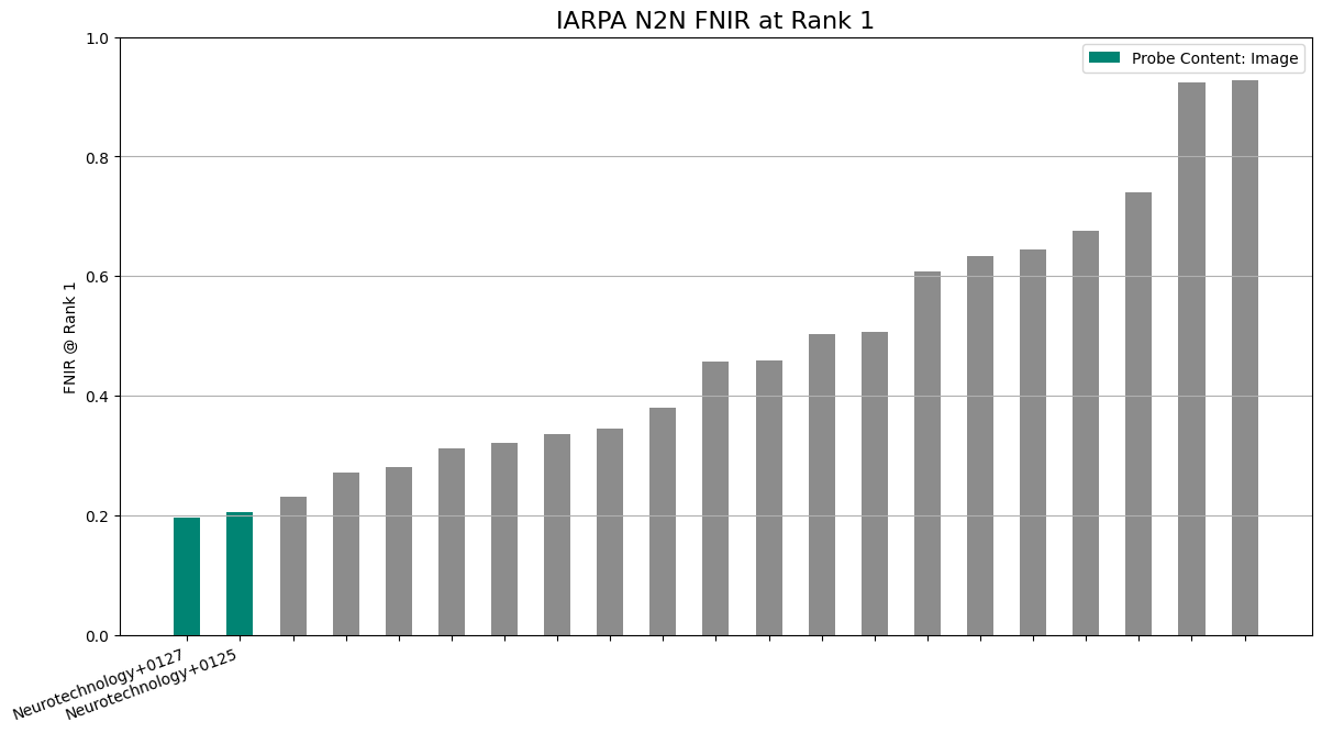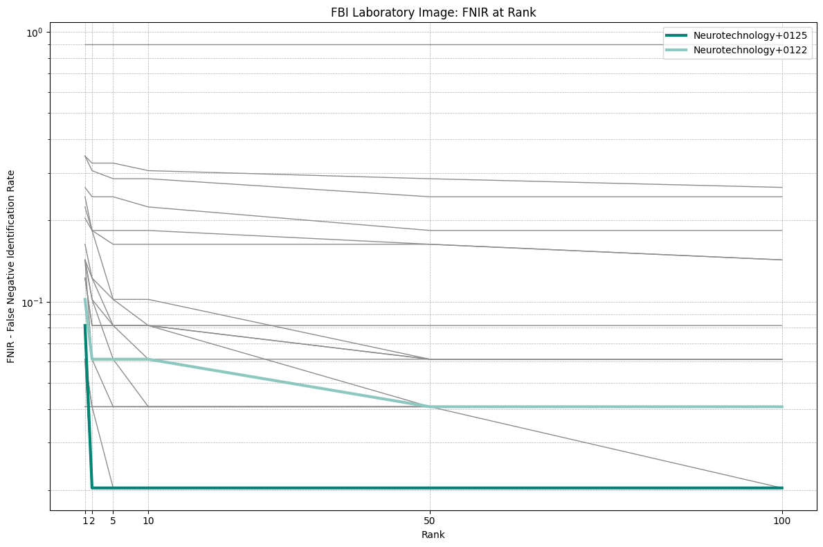 - FNIR @ Rank – False Negative Identification Rate at a given Rank. Representation of a semi-automated mode, where the system provides a list of candidates, and an expert can review up to any number of candidates. The rank indicates how many candidates need to be reviewed, while the FNIR shows the percentage of missed identifications. This metric is also called "Investigation".