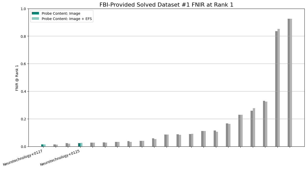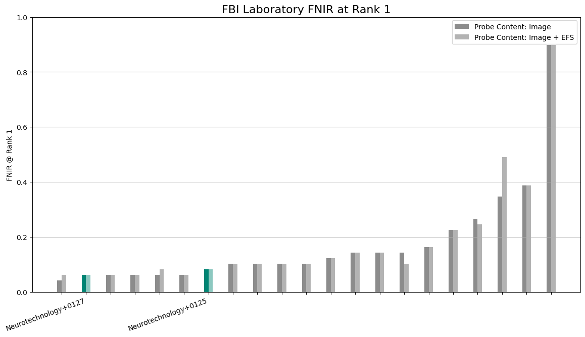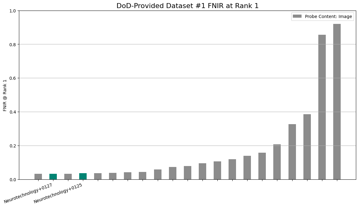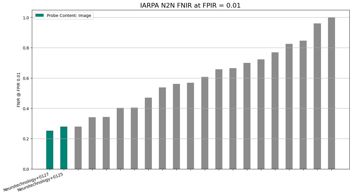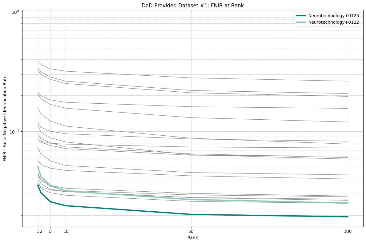 - FNIR @ Rank – False Negative Identification Rate at a given Rank. Representation of a semi-automated mode, where the system provides a list of candidates, and an expert can review up to any number of candidates. The rank indicates how many candidates need to be reviewed, while the FNIR shows the percentage of missed identifications. This metric is also called "Investigation".