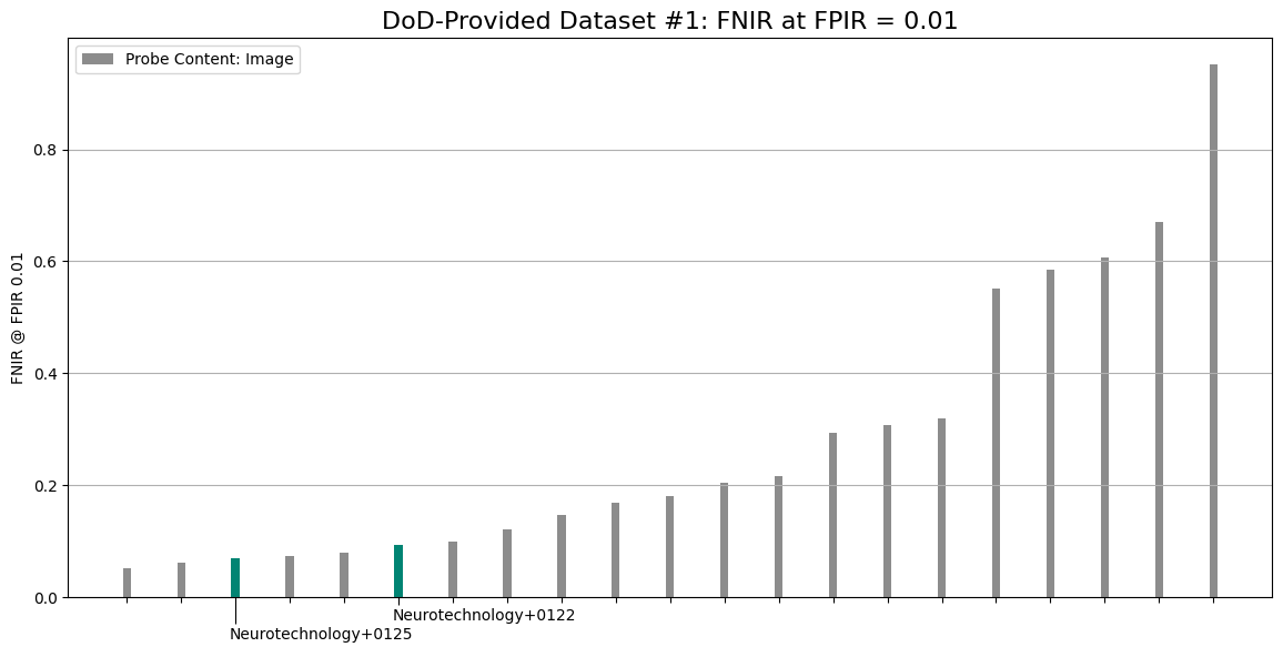 - FNIR @ FPIR – False Positive Identification Rate at a given False Negative Identification Rate. This metric is used to measure how well the system would perform in a fully automated mode. A threshold is set for a certain FPIR (i.e., the allowable number of errors), and the corresponding FNIR (i.e., the percentage of missed identifications) is observed. This metric is also called "Identification".
