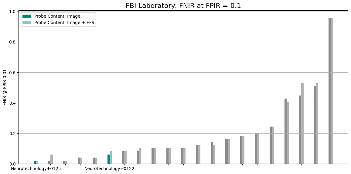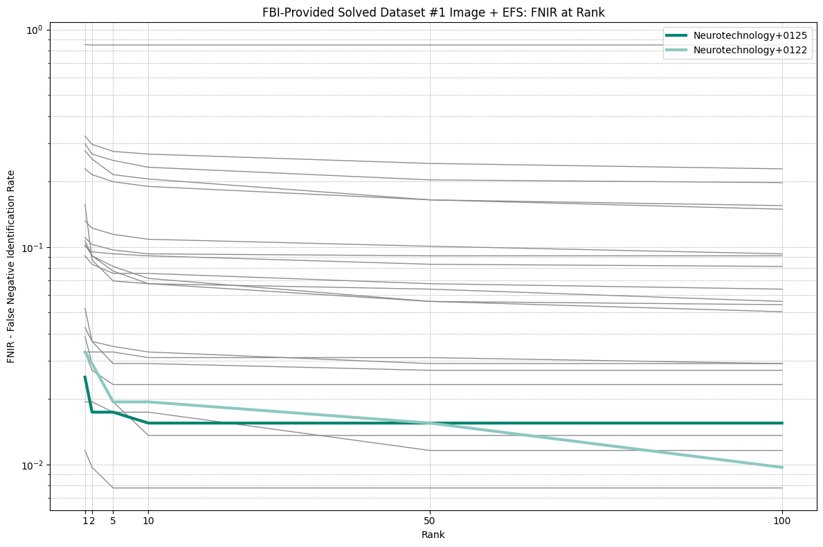 Evaluation results of the latest algorithm submission, Neurotechnology+0125, and the previous submission, Neurotechnology+0122, are provided below for each testing scenario with specific datasets. The analysis follows the same principles as NIST results reporting, showing only the best-performing submission from each vendor and highlighting the differences between algorithm providers.