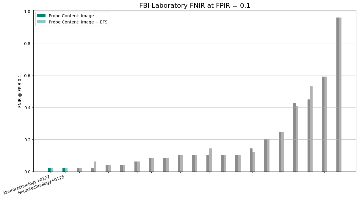 Evaluation results of the latest algorithm submission, Neurotechnology+0127, and the previous submission, Neurotechnology+0125, are provided below for each testing scenario with specific datasets. The analysis follows the same principles as NIST results reporting, showing only the best-performing submission from each vendor and highlighting the differences between algorithm providers.